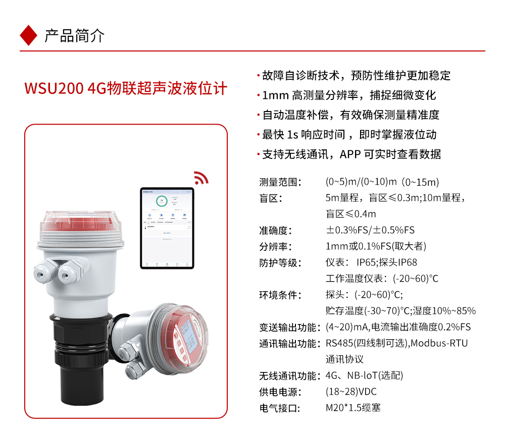 金莎9001zz以诚为本WSU-200 4G物联超声波液位计具有高可靠性、高性价比、易安装维护的液位/物位测量仪器,可广泛用于各种液体和固体物料高度的测量。本产品可选配 NB-IoT 无线通讯功能,用户可在仪表云平台进行数据查看和远程监控。常见的应用工况,如市政、化工、储运等工业环境中的河流、水池、储罐等液位测量。咨询热线:400-152-1718